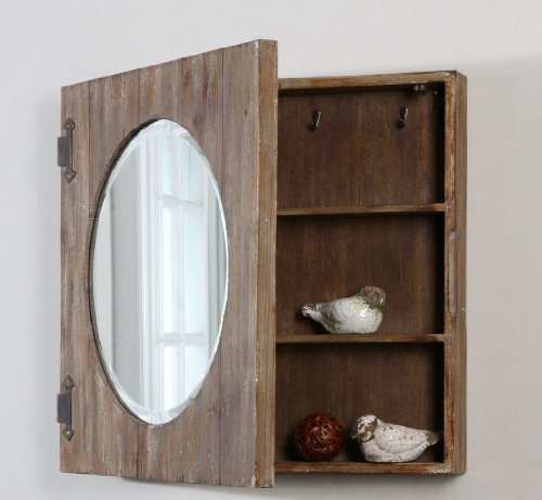 Contemporary rustic medicine cabinet features aged wood with a light ivory wash, rustic olive bronze hinges and an oval mirror