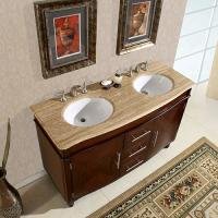 Cambridge 55 in. Double Sink Bathroom Vanity Cabinet - Faucets not included. Transitional style. Pre-drilled for three-hole, 8-in. widespread faucets. Three drawers and two door storage with shelves. Undermount UPC certified white ceramic sinks. Roman vein-cut travertine stone counter top. Brushed nickel hardware finish. Big cutout back for plumbing installation. 30 days manufacturer limited warranty. Made from wood, CARB Ph2 certified plywood and MDF panels. Distressed dark chestnut finish. No assembly required. Center to Center: 35 in.. Overall: 5