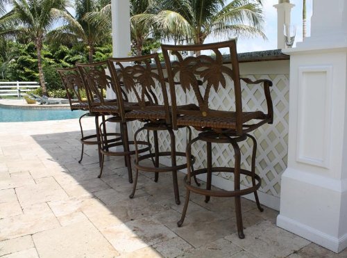 Coco Palm 4 Pcs Patio Swivel Bar Stools in Dark Bronze - 30 in. Swivel bar stool . Finished in a powder coated Dark Bronze . Weather and UV resistant . Constructed of extruded Aluminum frame will not rust . Matching seating group and dining available . Sturdy Aluminum legs for extra support . 23 in. W x 29 in. D x 47 in. H (20 lbs.) This traditional Coco Palm collection incorporates a carved tropical palm tree design on an extruded Aluminum frame that will not rust. The deep seating includes cushions, while the dining chairs and bar stool are beautifu