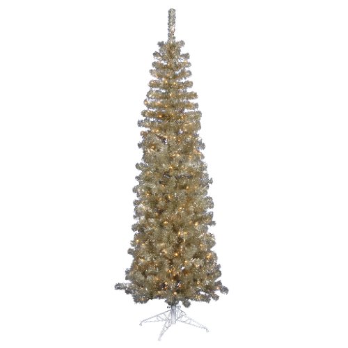 Vickerman Pencil Christmas Tree - Splash a little fun into your holiday with the Vickerman Champagne Pencil Christmas Tree. This fun pre-lit Christmas tree features clear mini-lights that come complete with a convenient on/off footswitch, eliminating the hassle of extension cords and power outlets. The unique pencil-like body shape offers a sophisticated touch for any decorating this season. Specifications for the 4.5 ft. Tree Shape: Slim Base Width: 20 inches Number of Bulbs: 150 Number of Tips: 299 Specifications for the